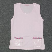 Ladies' sleeveless pullover, round neck, plain knit allover, 2 patch pockets, tubular neck, arm & waistband, sequins at neck & pocket, flower ...