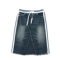 Mid-length skirt with blue stretch rain denim, monkey & whisker acid wash plus rubbing stripes. (with white and blue fabric on the top and both sides)