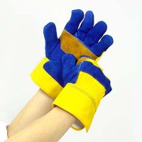 Blue split leather with yellow split reinforced palm, yellow cotton, rubberized cuff